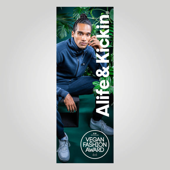 Tropische Blattformen in Blau, Magenta und Dunkelblau mit der Herausforderung Farbverläufe abzubilden ohne auf teureren Digitaldruck zurückzugreifen. Die Lösung waren Halftones, die mit wenigen Farben Verläufe simulieren und somit produktionseffizient bleiben.